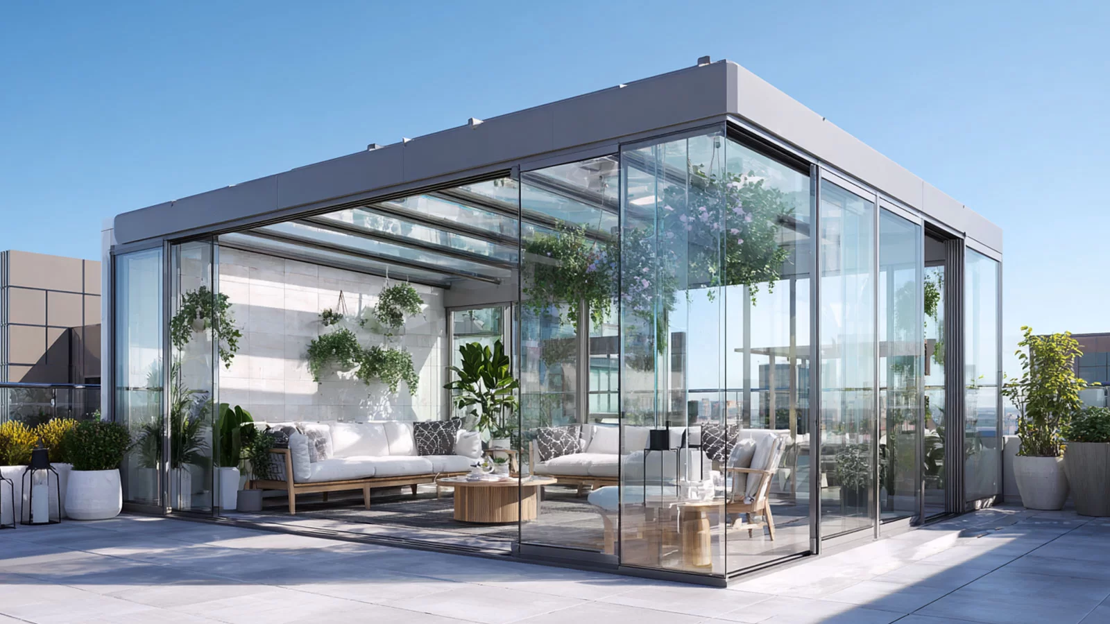 Sistemde 8 mm ve 10 mm tek cam veya 4+9+4 mm ısıcam kombinasyonları tercih edilebilir. Isıcam seçeneği sayesinde ısı yalıtımı artırılır ve dört mevsim konforlu kullanım sağlanır.